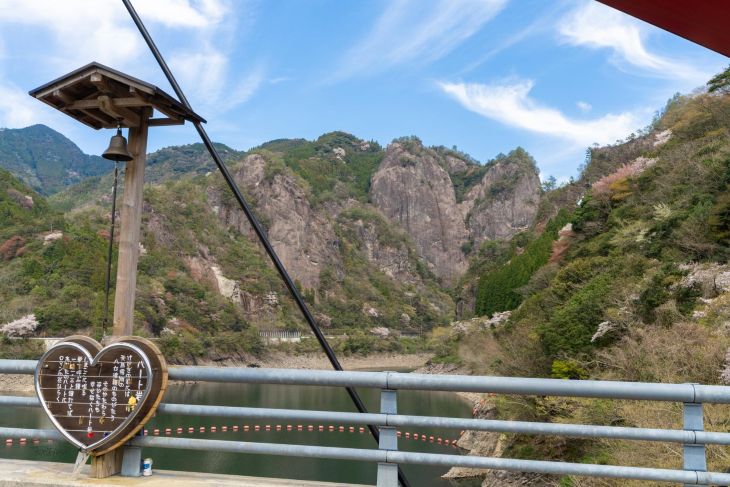 赤いアーチ橋から見えるハート形の巨岩石は、恋愛のパワースポットとなっています。