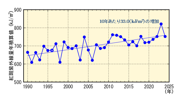 こちらは気象庁がつくばで観測した紫外線に関するデータですが、沖縄の紫外線量も年々、右肩上がりで増加の一途をたどっていることは間違いなさそうです。