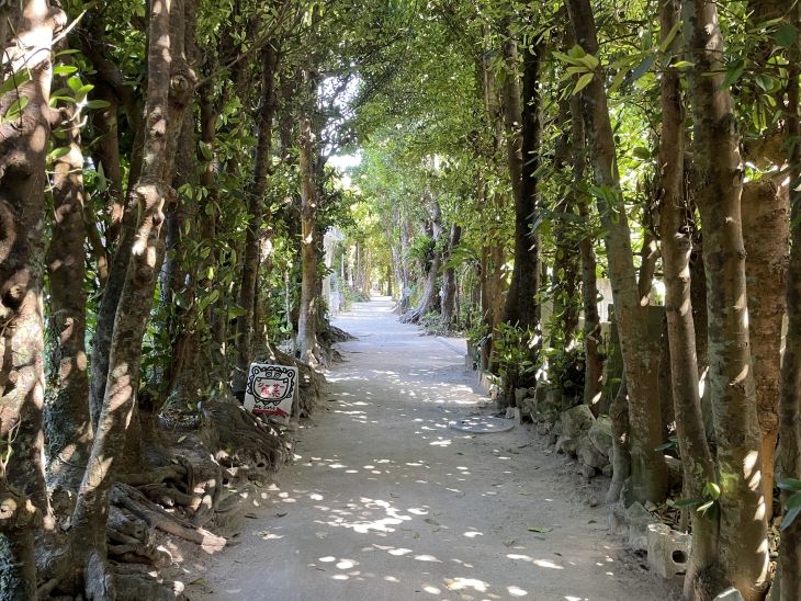 もともとは防風林の役割をしているフクギが連なって並木道となっている場所です。なかには推定樹齢が300年のフクギも!